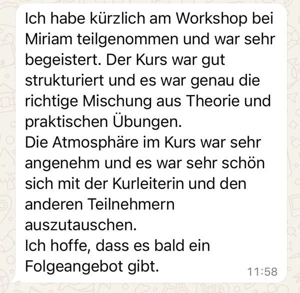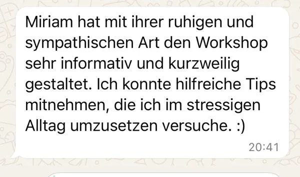 Das Webinar dauert ca. 60 Minuten. Miriam führt dich mit viel Herz Schritt für Schritt durch drei alltagstaugliche Impulse – es gibt auch genügend Raum für deine Fragen am Ende.